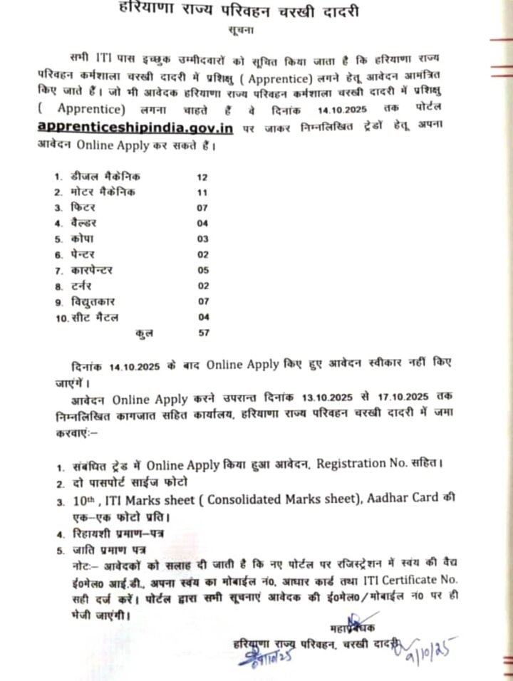 Charkhi Dadri Roadways Apprentice 2025: Charkhi Dadri Roadways ने Apprentice के पदों पर भर्ती का नोटिफिकेशन जारी कर दिया है। जो की आधिकारिक वेबसाइट के माध्यम से जारी कीया गया है। इस भर्ती के लिए ऑनलाइन आवेदन 09 October 2025 से शुरू हो गए हैं। भर्ती के लिए महिला और पुरुष दोनों आवेदन कर सकते है।