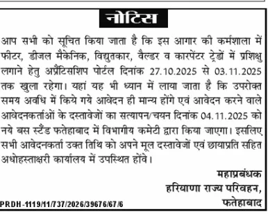Fatehabad Roadways Apprentice 2025: Fatehabad Roadways में Apprentice का नोटिफिकेशन जारी.. ऑनलाइन आवेदन शुरू