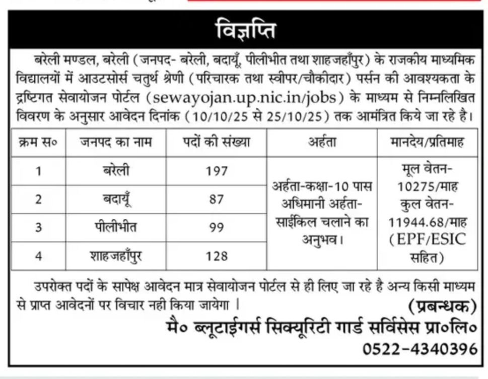 Government Secondary School UP Recruitment 2025: BTSC ने Chowkidar / Sweeper Posts के पदों पर भर्ती का नोटिफिकेशन जारी कर दिया है। जो की आधिकारिक वेबसाइट के माध्यम से जारी कीया गया है। इस भर्ती के लिए ऑनलाइन आवेदन 13 October 2025 से शुरू हो गए हैं। भर्ती के लिए महिला और पुरुष दोनों आवेदन कर सकते है।