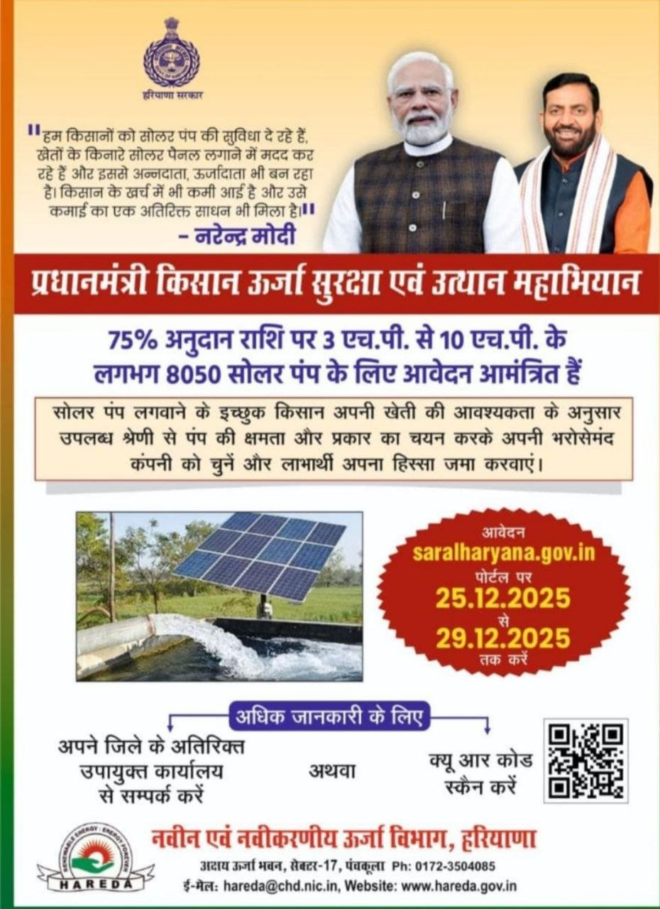 Haryana Solar Water Pumping Scheme 2025: हरियाणा सरकार के नवीन एवं नवीकरणीय ऊर्जा विभाग (HAREDA) ने किसानों की सिंचाई योजना का नोटिफिकेशन जारी कर दिया गया है। यह आधिकारिक वेबसाइट के माध्यम से जारी की गई है। इस सौर जल पंपिंग योजना 2025-26 के आवेदन कर सकते है। इस योजना के तहत, किसानों को 3 हॉर्सपावर (HP) से 10 HP क्षमता के सौर पंपों पर कुल 75% की सब्सिडी प्रदान की जाएगी,जिसमें 30% केंद्र सरकार और 45% राज्य सरकार का योगदान होगा। आवेदन करने से पहले आधिकारिक अधिसूचना अवश्य पढ़ें। इसके बाद अपना आवेदन करे। व योजना से संबंधित पात्रता , महत्वपूर्ण तिथियों के बारे में सभी जानकारी प्राप्त करे।