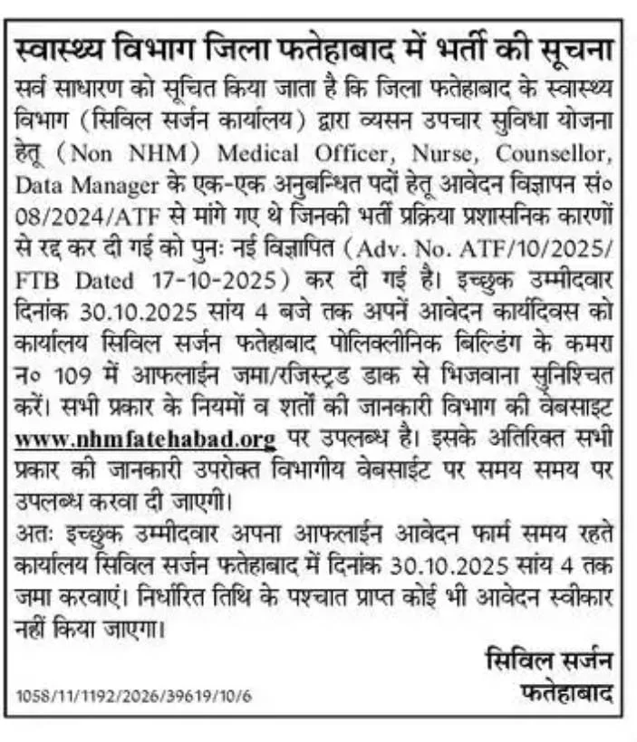 NHM Fatehabad Recruitment 2025: Notification, Eligibility Details and Offline Application Form